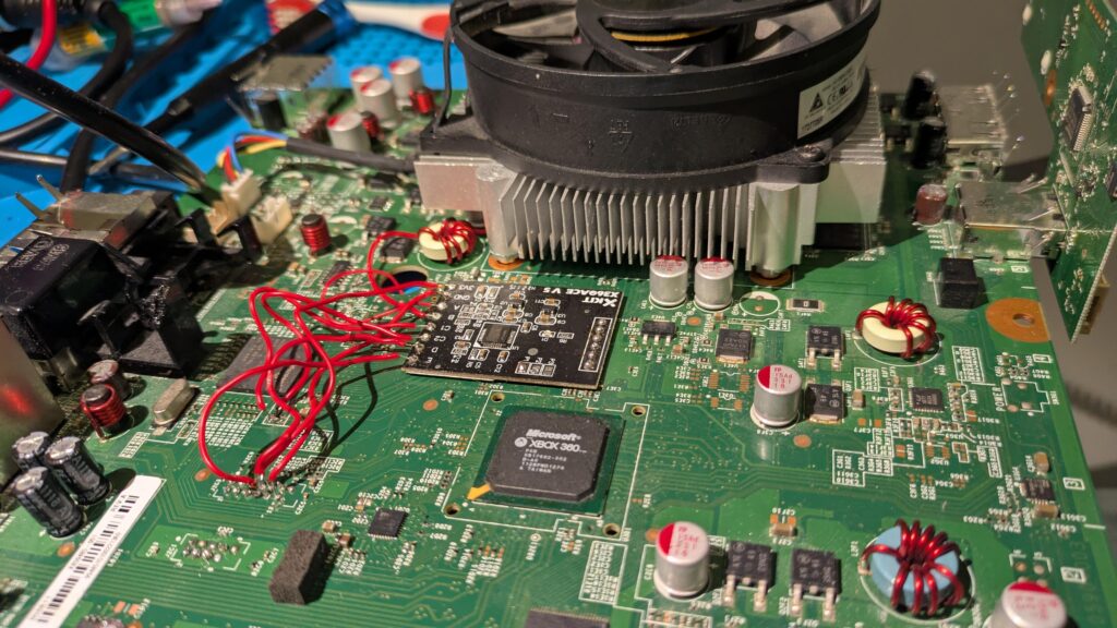 This is the Trinity board that I have bricked, and just look at the red wires on the board and please look closely at the solder joints… Please, ALWAYS use flux! In this instance, I didn’t even use flux as you can tell by the cold and dull-colored solder joints on both the motherboard’s points and the X360 ACE. And also, don’t use the X360 ACE v5 you see in the picture under ANY circumstance. Use 30AWG or smaller solid-core wires, don’t apply a very little amount of flux, and take things slowly. NEVER try modding consoles without trying and learning on something such as dead boards, I learned the hard way. Also, if you have lead-free solder, you can use that just fine, but leaded solder will make your life easier when soldering and requires a lower temperature to melt.