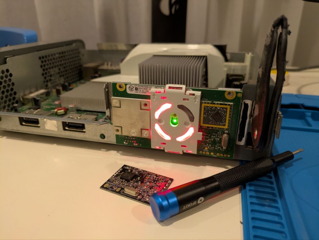 I cleaned all the dust with a brush, and started doing a few changes on my wiring, as I had to change a few wires for the Matrix glitcher, as I’ve tested the ACE in this console too. When it was all done, I clamped the heatsinks back on and I turned on the console with the eject button, and…