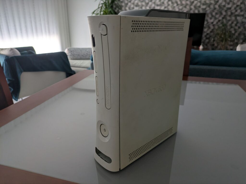 So, last month, August, I started looking for used Xbox 360 consoles for a good price… I was willing to get either Slim consoles with a Trinity board, or Phat consoles with a Jasper or Tonasket motherboard, since these are the most reliable consoles… I was willing to get a Trinity with no power supply included, since I already have one of those, or a Jasper/Tonasket with a power supply included, since I don’t have a phat power supply, and… I found a Tonasket for 20€, and with shipping I paid 32,68€ total! It came with a wired white controller which wasn’t in the best conditions but worked, a 250GB hard drive, and a 150W original power supply. The laser from the DVD drive didn’t work though, but I didn’t care (I will replace it myself, and besides, I was gonna mod the console anyways, so not having a disc drive really isn’t a big deal). Here’s the console I got: